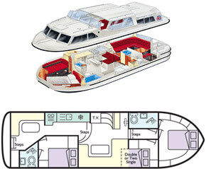 Available on the Norfolk Broads and Cambridgeshire waterways, these boats are available in a range of sizes sleeping from 2 to 10 people. The feature of this design is a large sliding canopy over the saloon of the cockpit area.