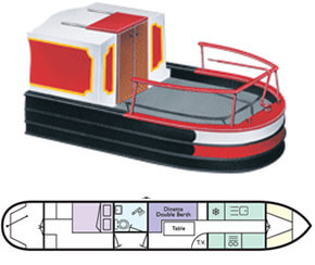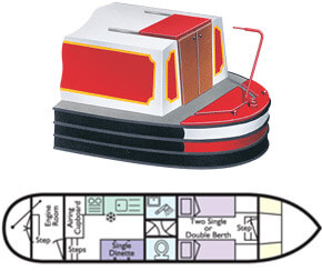 Narrowboats are available in a wide range of layouts, sleeping up to 12 people, and combine their picturesque style with comfortably appointed interiors with modern facilities. Detailed plans are show for each layout so that you can see exactly how your party will fit in on your chosen boat. Narrowboat sterns have three main "shapes" (see descriptions and illustrations below) and all steer by means of a tiller at the back, or stern. There are also wide beam narrowboats on some waterways, and in France some of these have wheel steering, as do French barges.