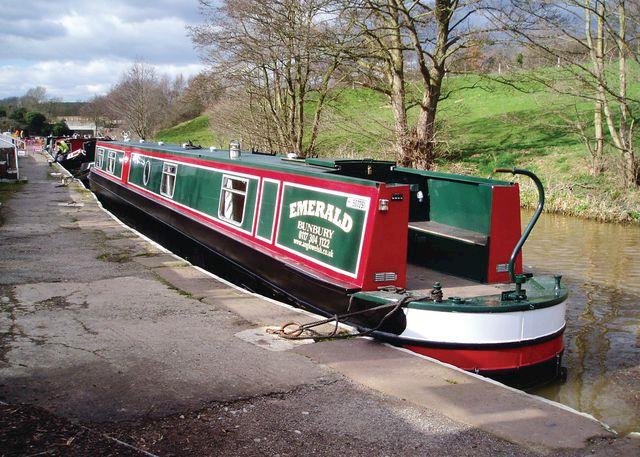 This style of narrowboat has a spacious rear deck area, enclosed by a guard rail.